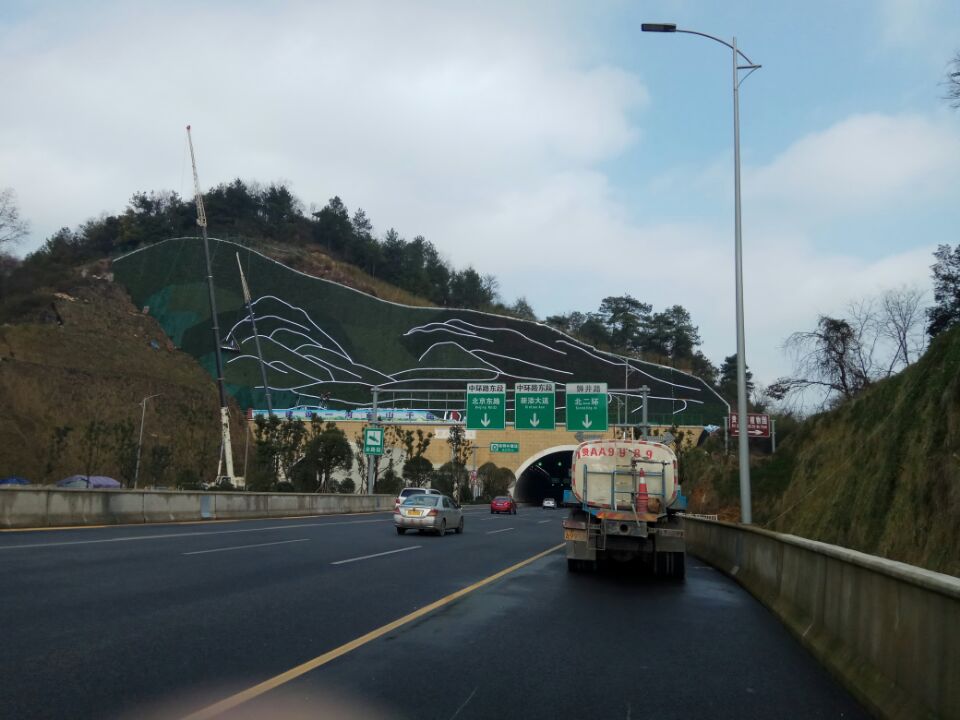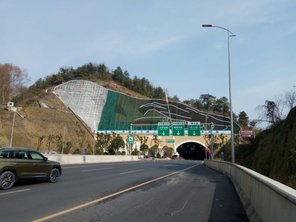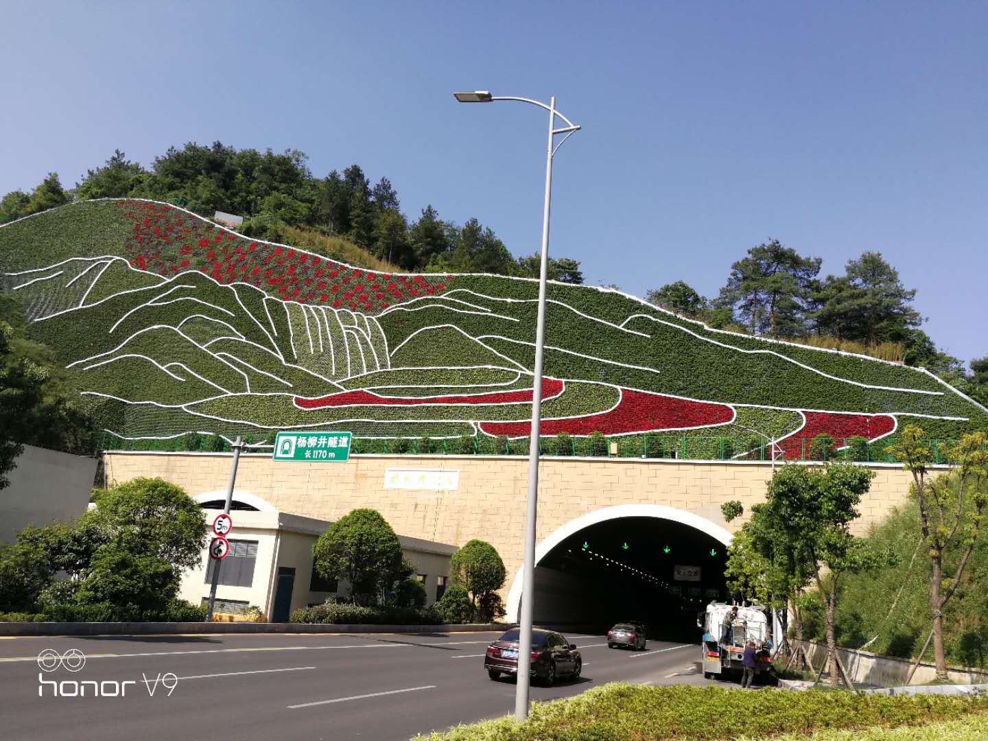 3、隧道口上方邊坡運(yùn)用國(guó)畫(huà)中白描手法將貴州獨(dú)特的山、水、田園風(fēng)光巧妙的融為一體,運(yùn)用不同色彩的植物劃分,塑造層次豐富,立體感的垂直綠化景觀。